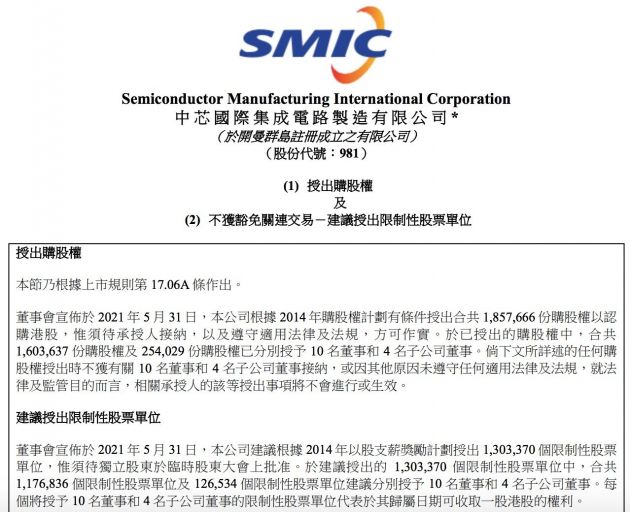 根据公告,中芯国际此次授出购股权的有效期为自2021年5月31日起计为期十年。