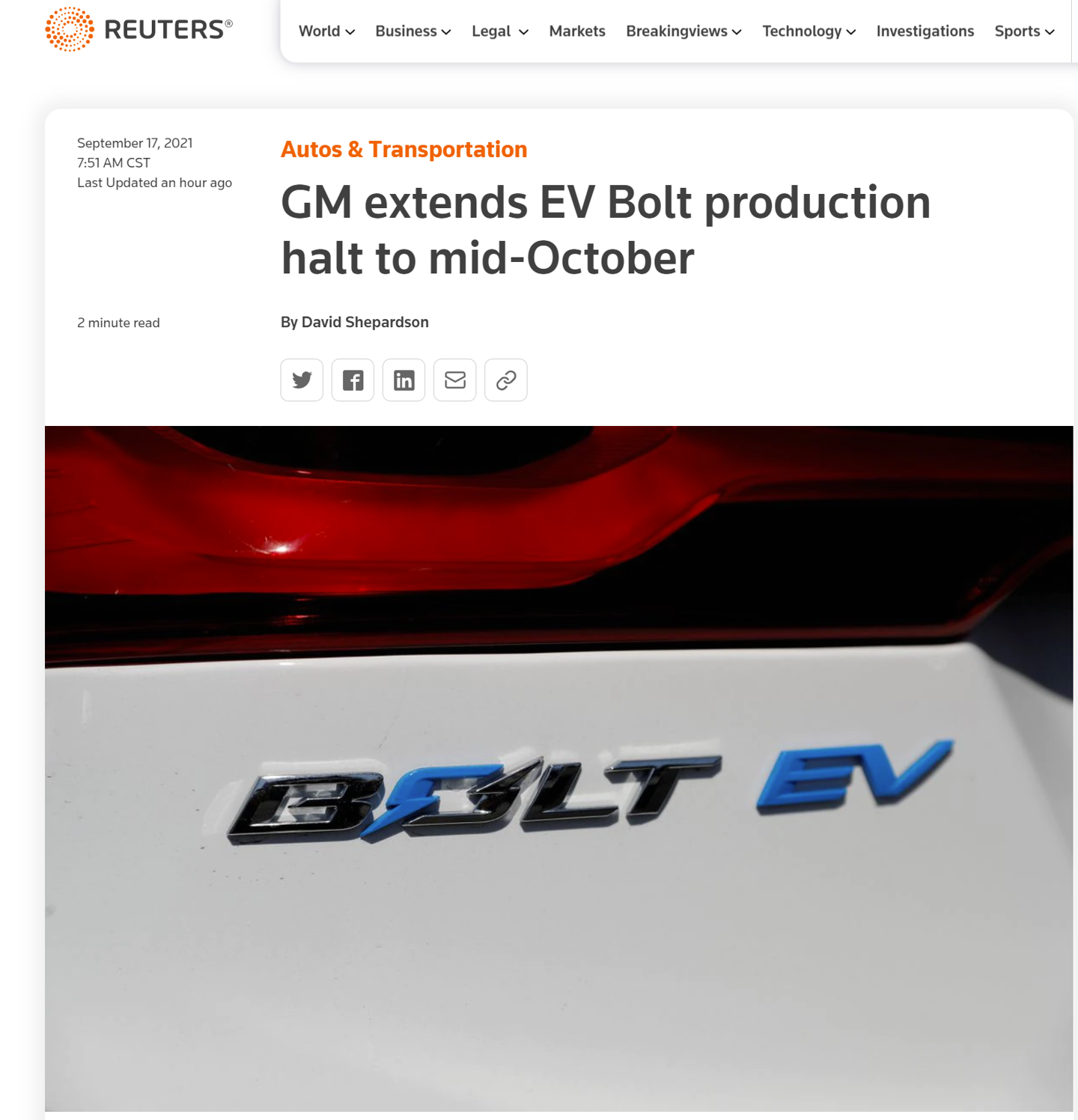通用汽车表示,在解决火灾风险问题前,不会恢复 Bolt 的生产或销售。该公司周四指出,已收到 12 起火灾和 3 人受伤的报告。